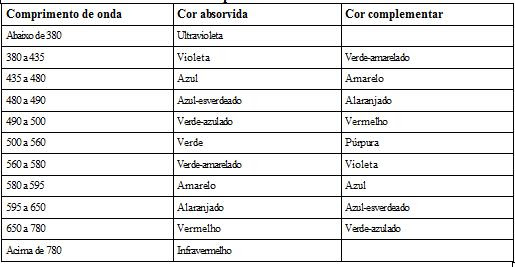 Concluindo, uma solução aparece como branca porque transmite luzes de todas as cores; quando absorve luzes de todas as cores, a solução é preta. Finalmente, a solução é verde quando absorve luz vermelha e transmite luz verde (amarelo + azul), a qual é denominada luz complementar. A Tabela 1.1 relaciona a cor da luz com a cor da luz complementar.